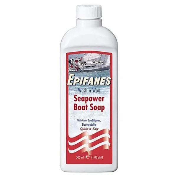 By far the best product for regular washing of boats, cars or mobile homes. Unlike most other soap brands, this highly concentrated product provides a clean, water resistant and streak-free film without removing the existing protective wax layer. It even adds strength to the existing wax layer. Wash-n-Wax Boat Soap is bio-degradable, pH-neutral and can be used on fibreglass, metal, rubber, wood and other types of (painted) surfaces. Epifanes Seapower Wash-n-Wax is very economical to use.